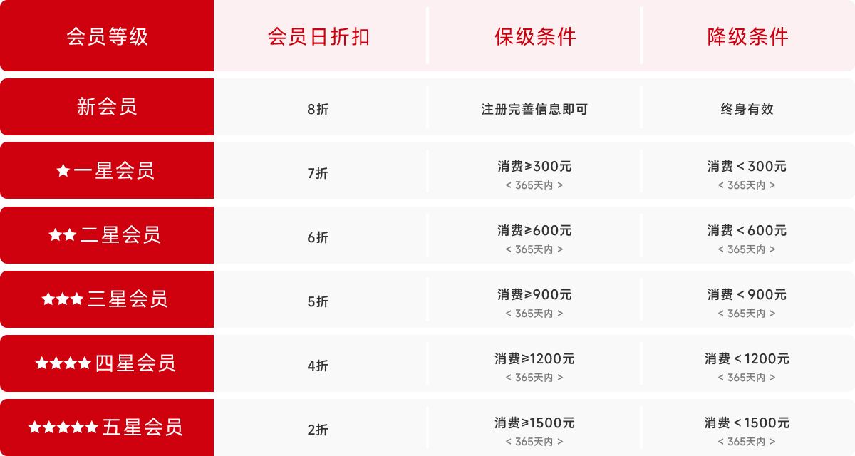 *等級有效期:除新會員(永久有效)外,一星、二星、三星、四星、五星會員均為365天